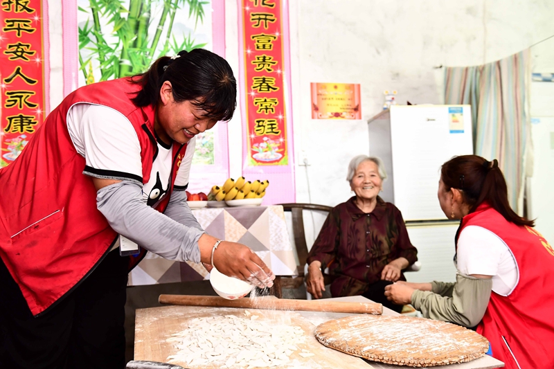 菏泽市郓城县唐塔街道宋屯村,居家养老服务中心的工作人员上门为92岁老人服务。 新华社记者 郭绪雷 摄